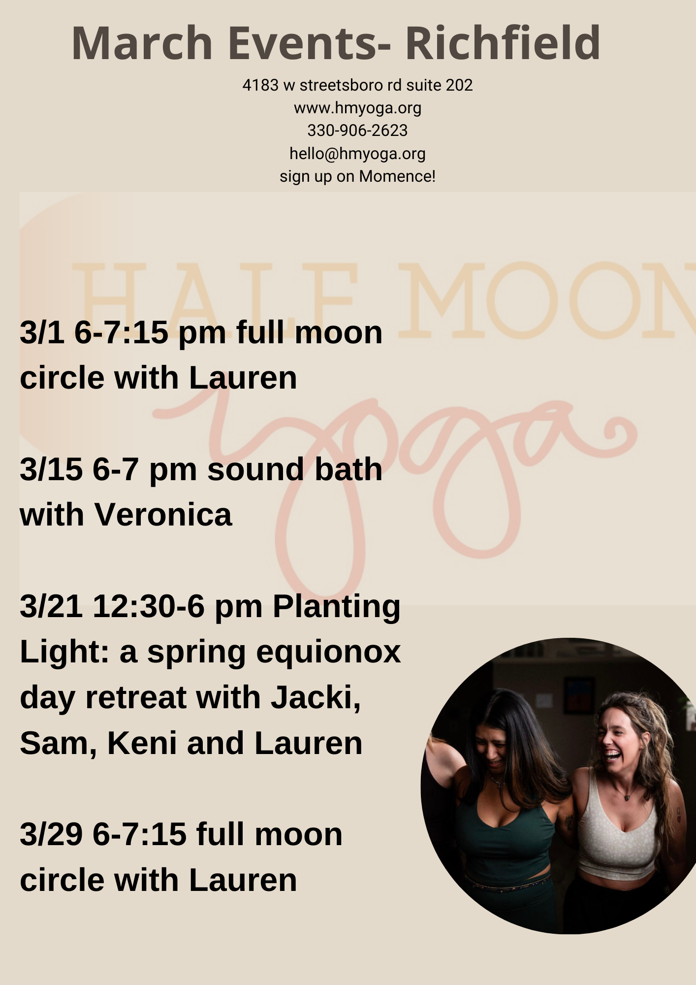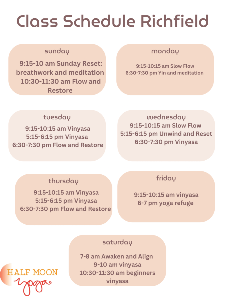 To see our class schedule and purchase passes please click here (be sure to click Richfield under locations) https://momence.com/u/half-moon-yoga-zcoJA6