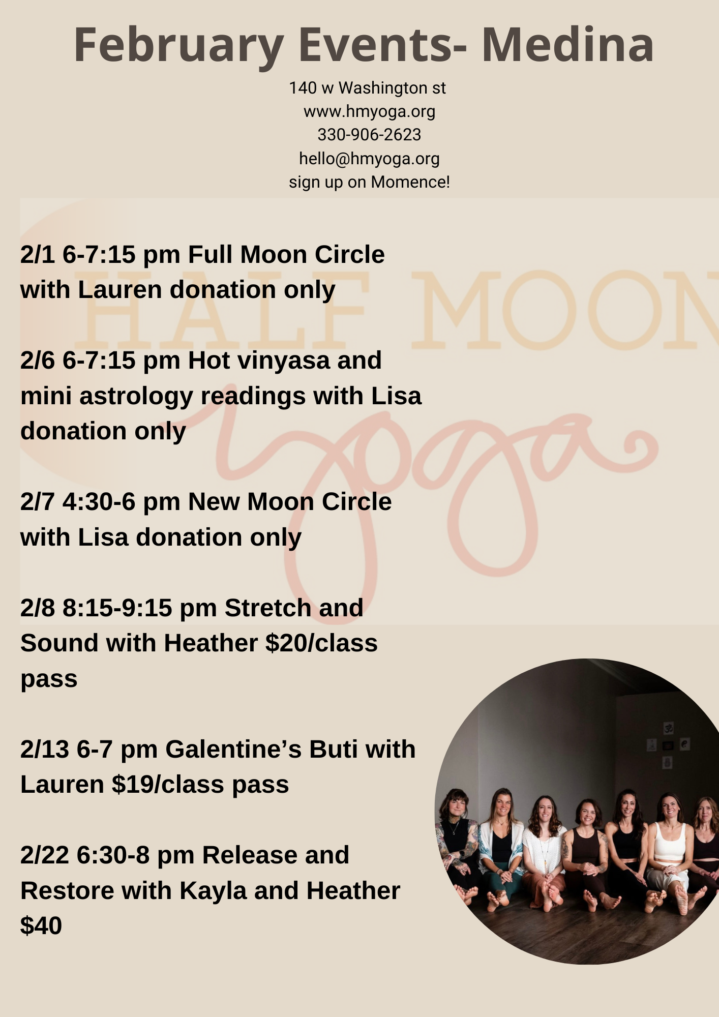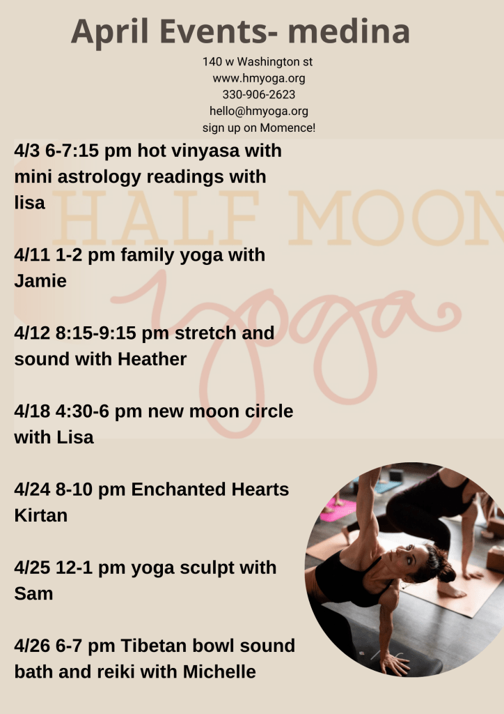 To see our class schedule and purchase passes please click here (be sure to click Medina under locations) https://momence.com/u/half-moon-yoga-zcoJA6
